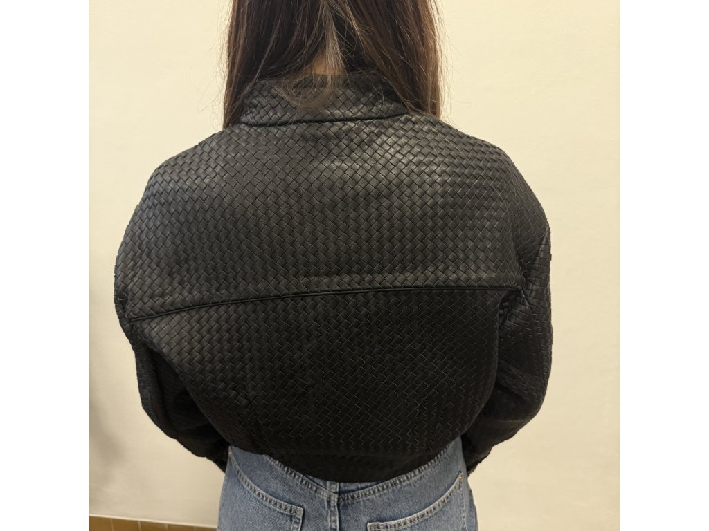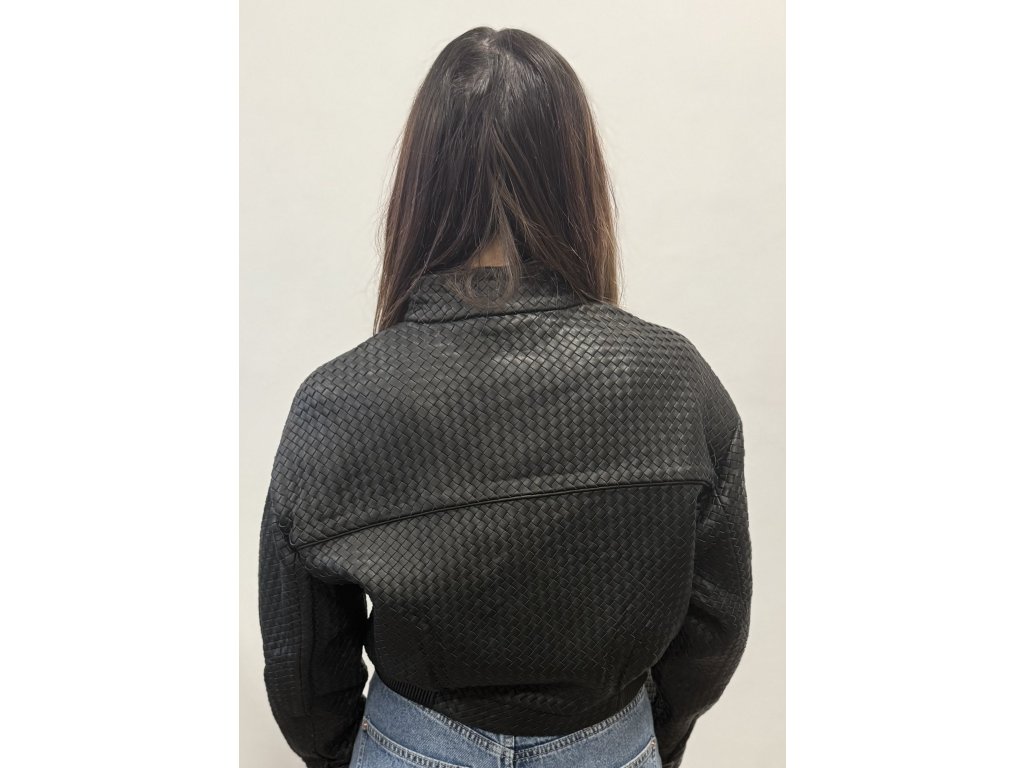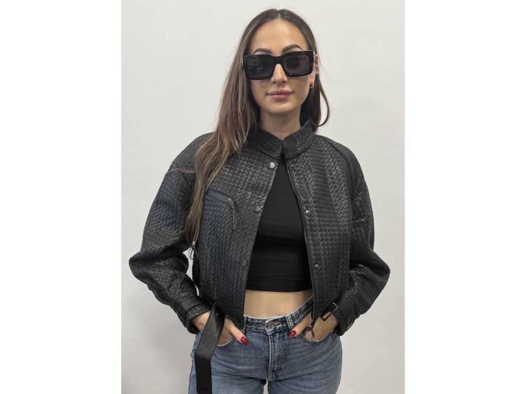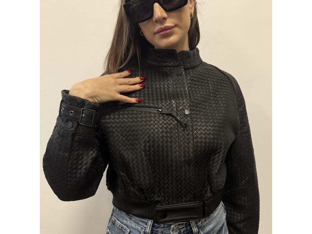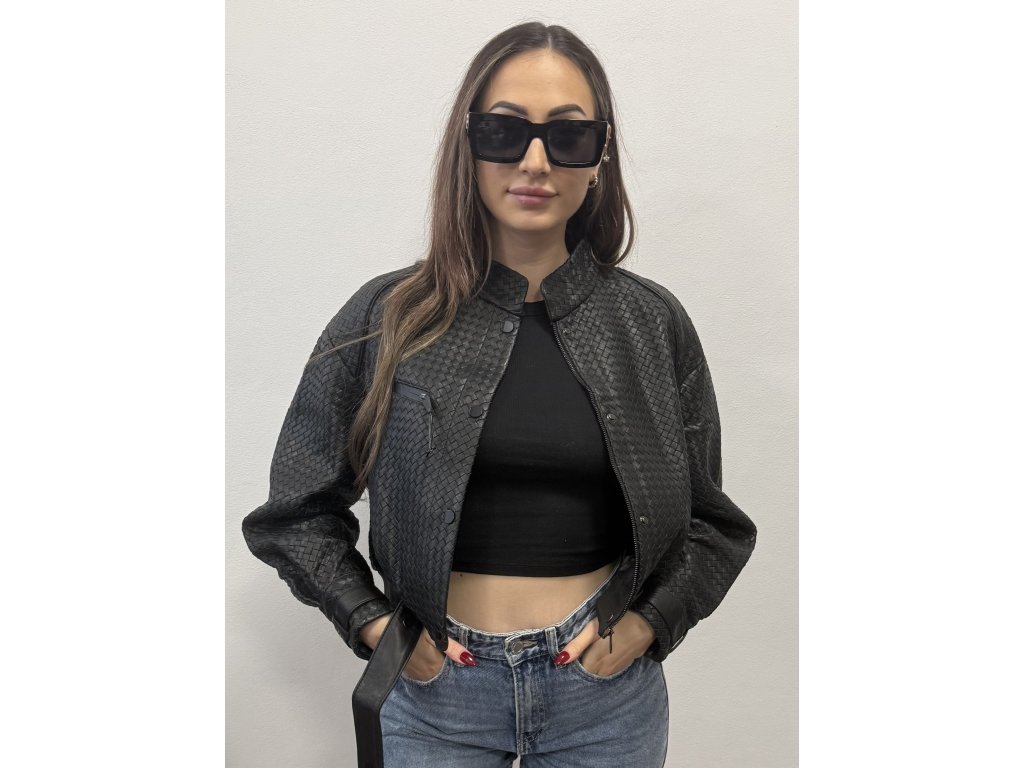 Bunda z pravé ovčí kůže má zajímavý design s texturou, která připomíná propletený vzor. Má zapínání vpředu na zip a cvoky, což přidává praktický i stylový prvek. Tento detail zapínání také zdůrazňuje její moderní design a usnadňuje nošení, a má široké rukávy zakončené nastavitelnými manžetami s kovovými cvočky a přezkami, které jí dodávají stylový a moderní vzhled. Bunda je vybavena také stojatým límcem, což přispívá k její elegantní siluetě.