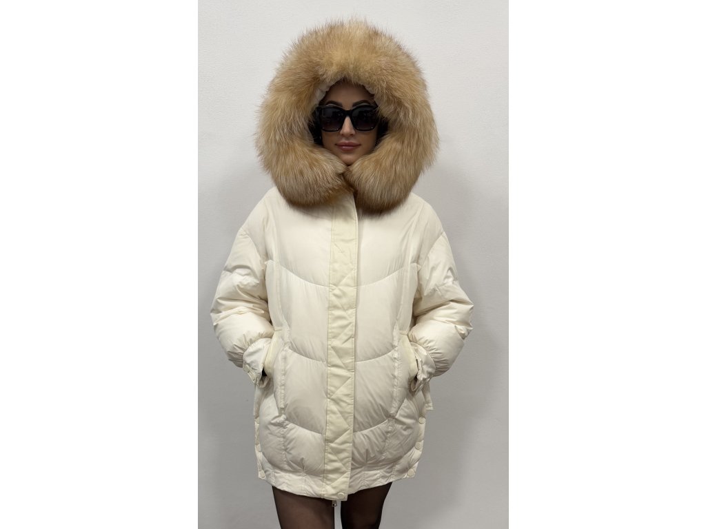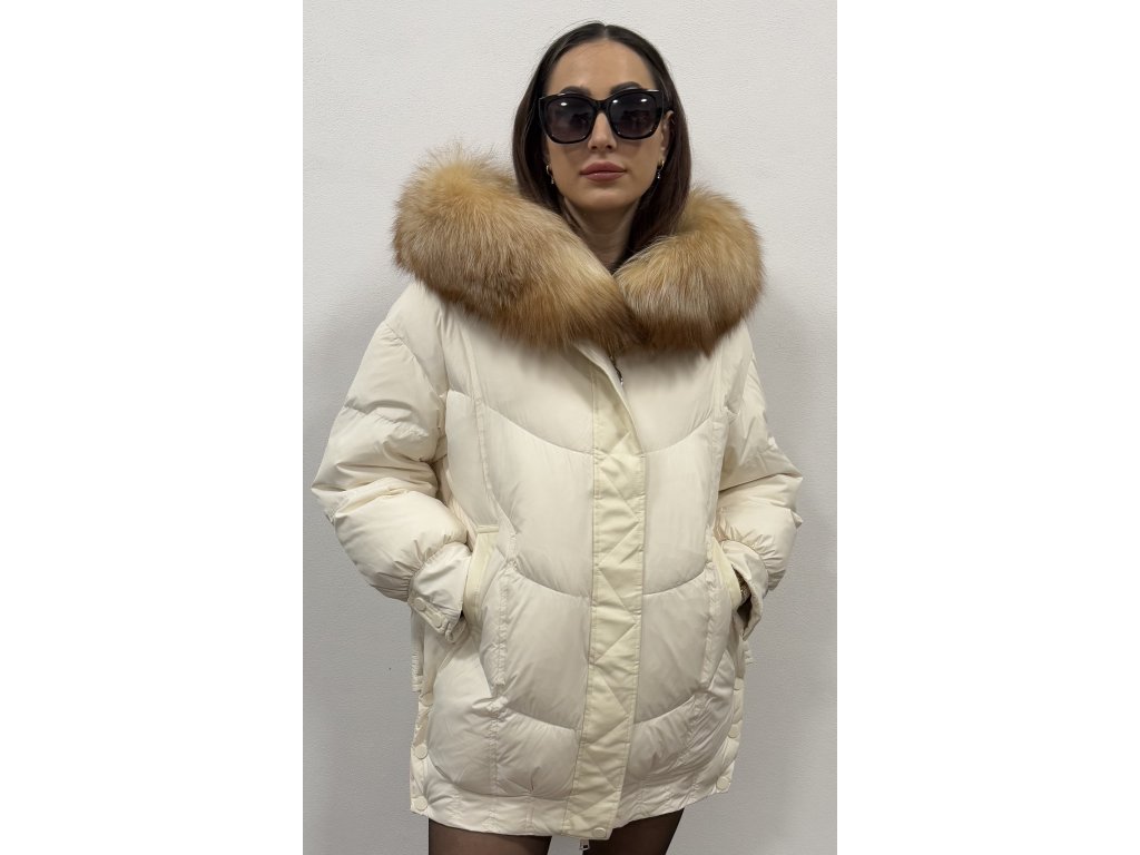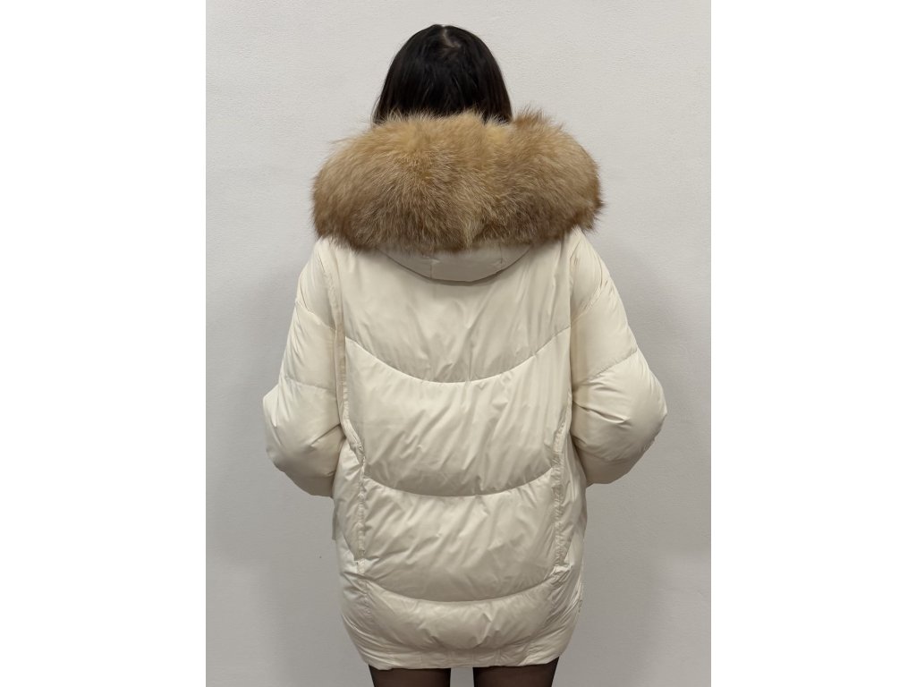 Tato péřová bunda s pravou liščí kožešinou kolem kapuce a předních lemů je dostupná ve třech elegantních barvách – bílé, černé a krémové. K dispozici je ve velikostech S, M a L. Bunda má dvě přední kapsy, kožené lemování na kapsách a okrajích lemu přispívá k lepší odolnosti a snadné údržbě. Bunda je navržena s bočními cvoky ve spodní části, díky kterým ji můžete nosit jako delší variantu nebo je zapnout a bundu přizpůsobit jako kratší model podle potřeby (viz foto).