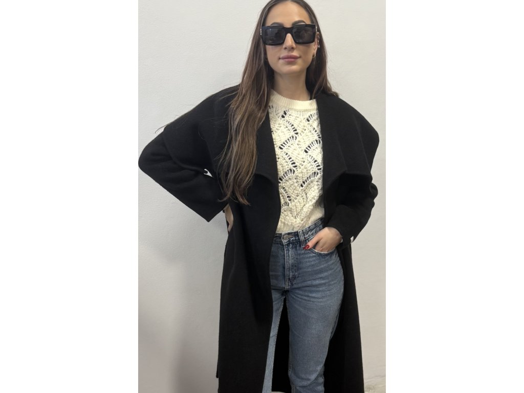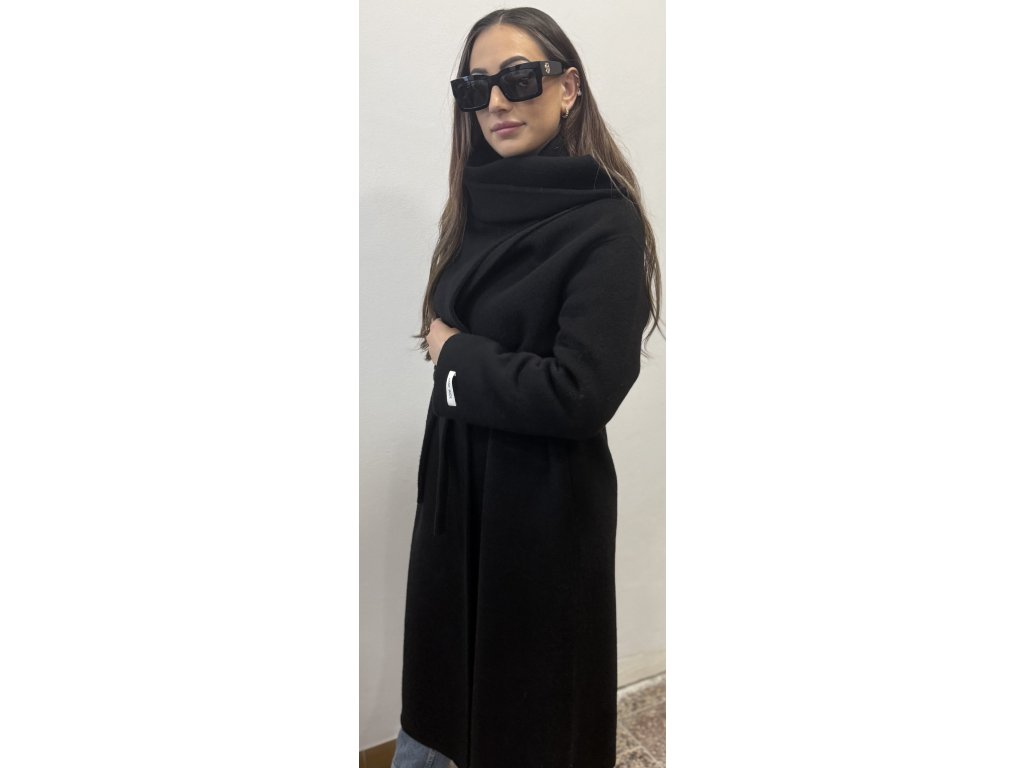 Elegantní dlouhý černý kabát má zajímavě řešený límec, který lze rozložit a nosit jako šálu, což je praktické v chladném počasí. Na zadní straně se nachází uzavřený rozparek, což přidává kabátu na pohodlí a umožňuje volnost pohybu.